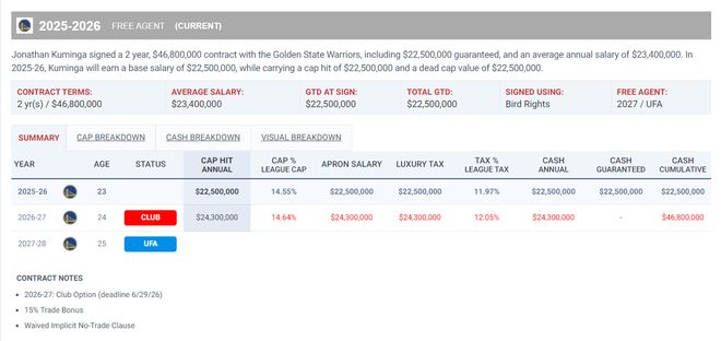 库明加今夏与勇士达成一份两年4680万的续约合同,25-26赛季年薪为2250万,如果勇士交易他才触发15%的交易保证金,这样才能达到两年4850万。如今还有人觉得库明加这个合同贵吗?