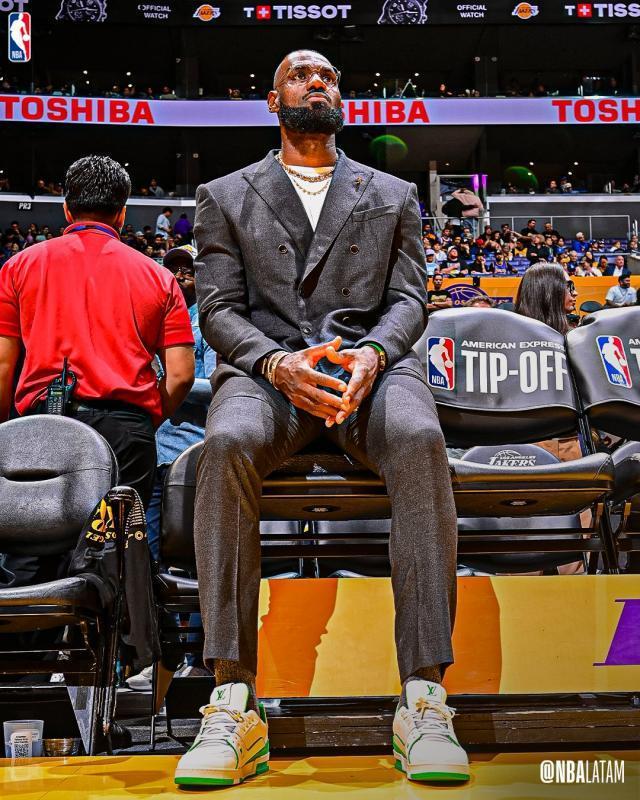 由于坐骨神经痛影响到下背部和右腿,詹姆斯在揭幕战当晚身着西装、佩戴眼镜,坐在替补席末端的软垫椅上,神情平静。这是他在23年NBA生涯中首次缺席常规赛揭幕战。